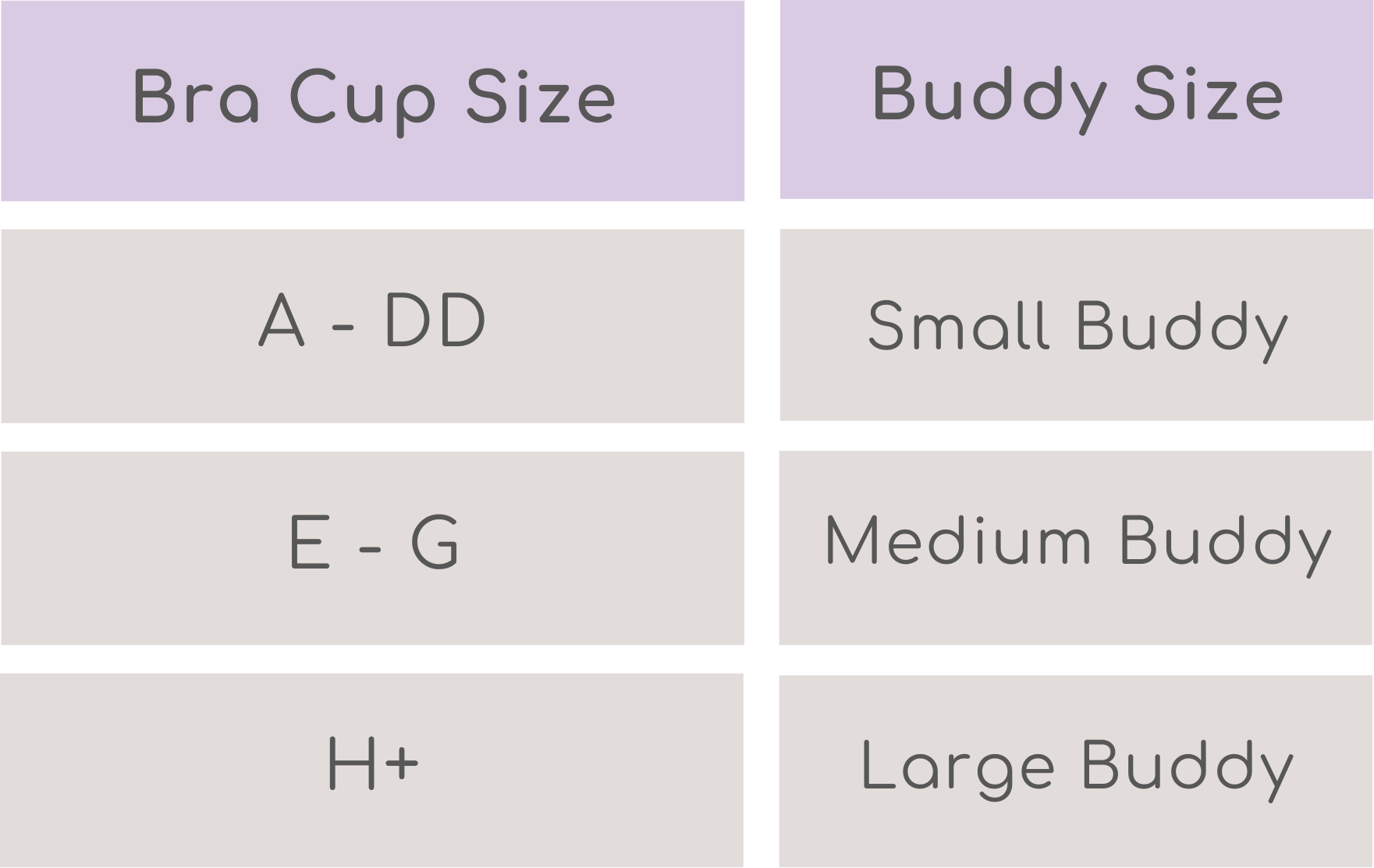 Use your current bra cup size along with our sizing chart to help determine the best size Buddy for you.
